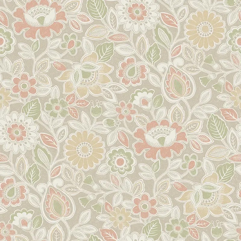 Papel pintado romántico diseño floral años 30 en beige y multicolor de Borastapeter, colección Borosan Hem. Calidad tejido no-tejido lavable, medidas: 53 cm x 11,2 m.