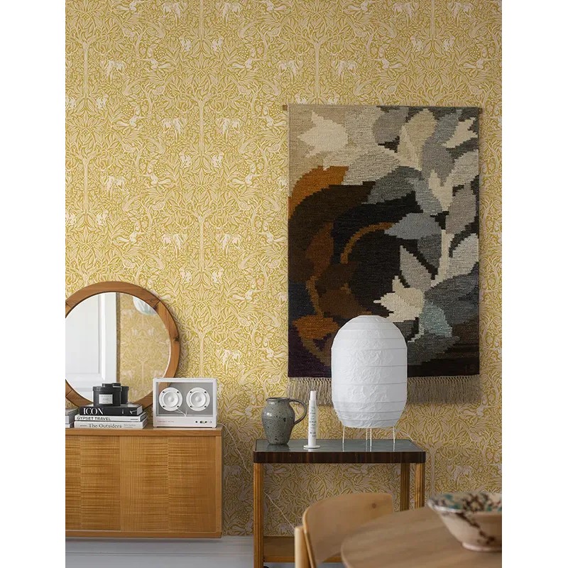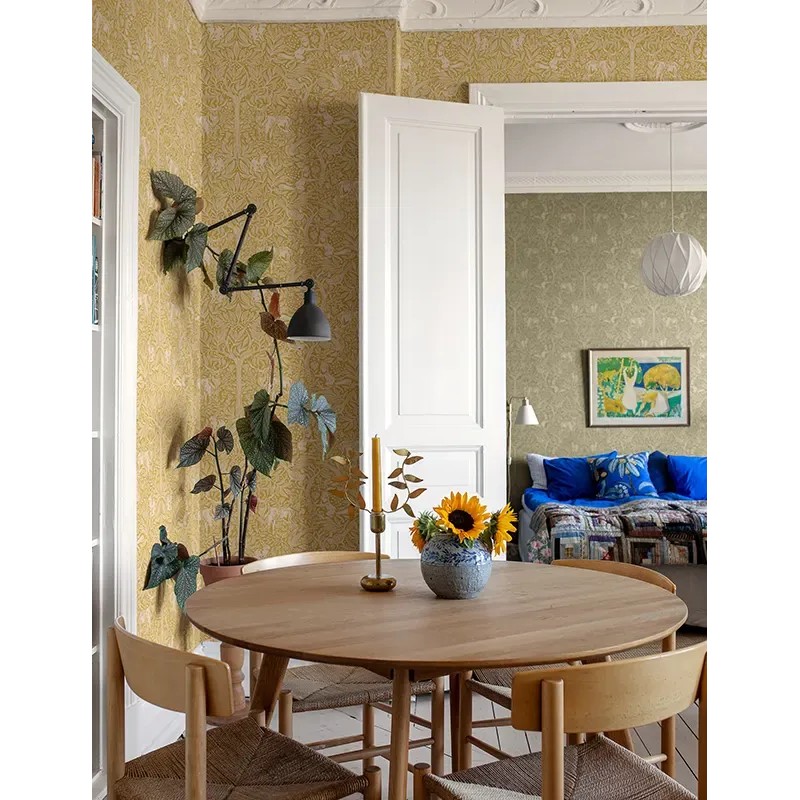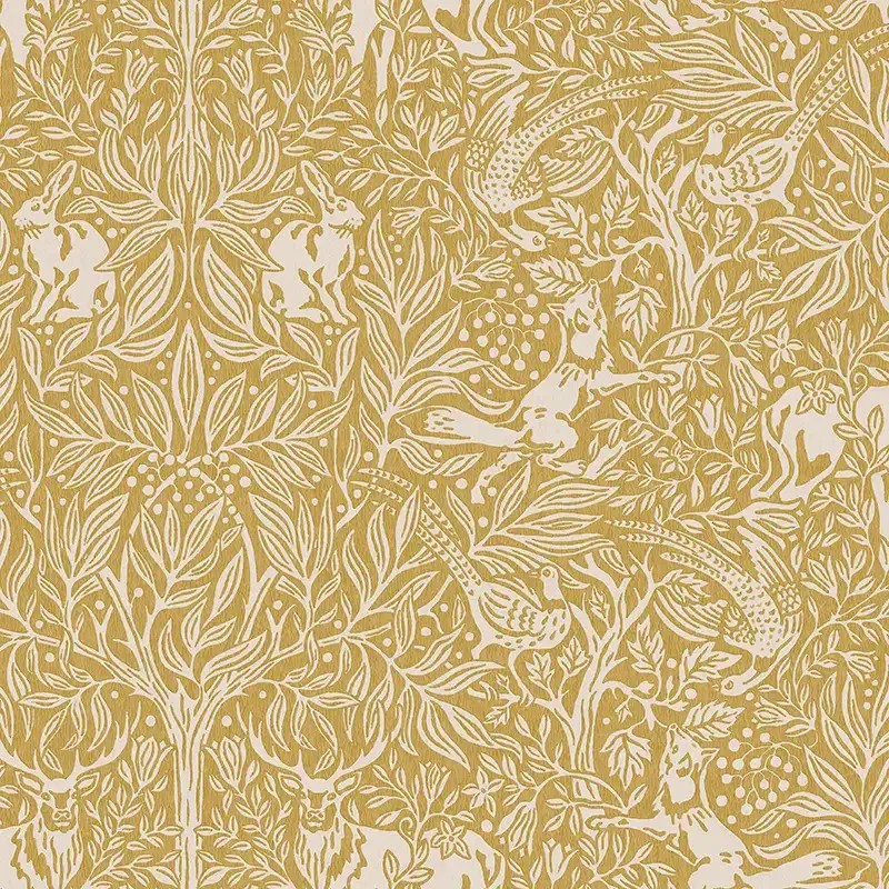 Encantadores tonos de amarillo ocre y beige, nuestro papel pintado Under the Elder Tree es armonioso y sutil, pero rebosante de una gran cantidad de detalles y sorpresas. A la sombra del poderoso saúco, se encuentran un majestuoso ciervo rojo y una tímida liebre de campo, mientras que los faisanes huyen de un astuto zorro. Un papel pintado ideal para colgar en su dormitorio, salón o pasillo para una apariencia relajante pero llena de interés y profundidad.