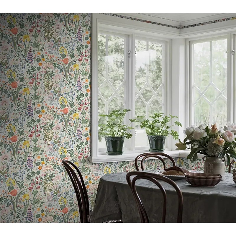 Papel pintado floral escandinavo multicolor sobre blanco