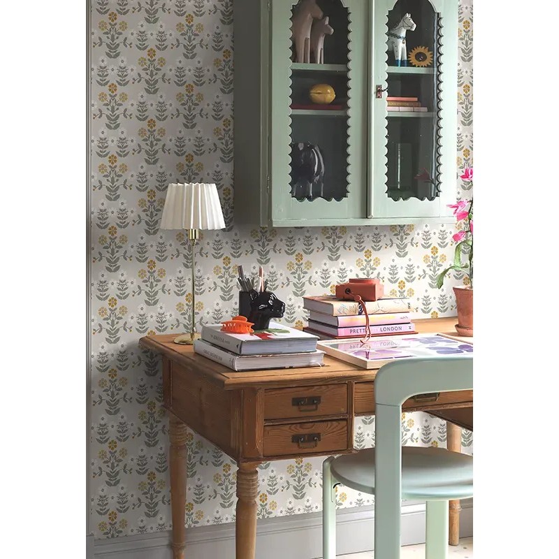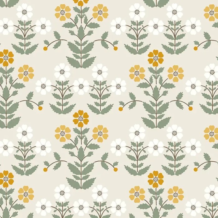 En tonos amarillos alegres y grises fríos, nuestro papel pintado Sippor evoca pensamientos sobre la energía y la alegría de las flores primaverales en plena floración. Diseñado por el pintor profesional Oskar Bergman a principios del siglo XX, presenta un patrón regular de delicadas anémonas en tonos soleados de amarillo con toques de marrón, gris, blanco y verde impreso con una técnica de colografía tradicional. Cuelgue el papel pintado Sippor en su salón, habitación, cocina o pasillo para obtener una expresión versátil, hogareña y vívida.