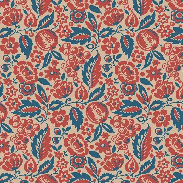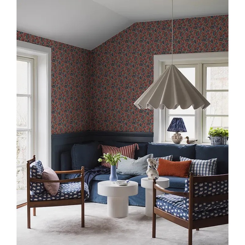 Dé un paseo por el jardín en el momento de la cosecha con nuestro papel pintado Elise en una paleta clásica y de inspiración folclórica de rojo intenso y azul intenso. Con un patrón rústico y denso de flores, follaje, frutas y bayas, siéntate y relájate mientras te pierdes en este caprichoso diseño. Este papel pintado con estampado de colografía funciona de maravilla como pared o en las cuatro paredes de su cocina, comedor o dormitorio.