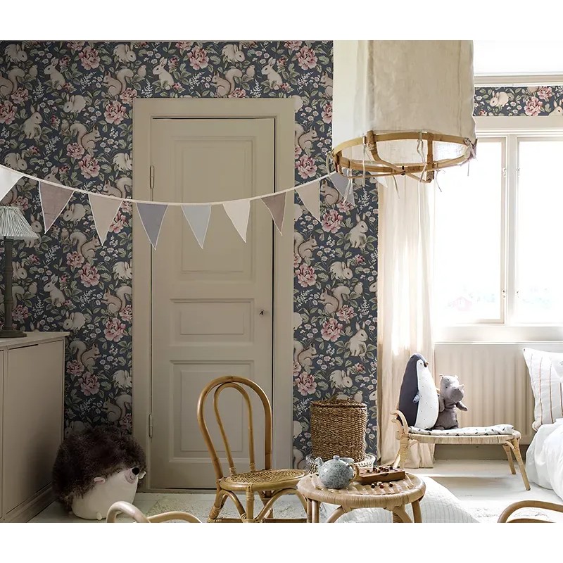 Coloreado con un encantador fondo azul oscuro con detalles rosas y verdes, nuestro papel pintado infantil Magic Forest es encantador y emocionante. Con un divertido diseño de conejos juguetones, ardillas curiosas y flores extravagantes, enciende la imaginación y crea un personaje versátil que se adapta a la perfección a medida que su hijo crece. Este maravilloso papel pintado Magic Forest fue creado en colaboración con la marca sueca de estilo de vida Newbie. Cuélgalo en el dormitorio, la sala de estar o el estudio de tu hijo para obtener un espacio cautivador y tranquilo que alimentará su imaginación.