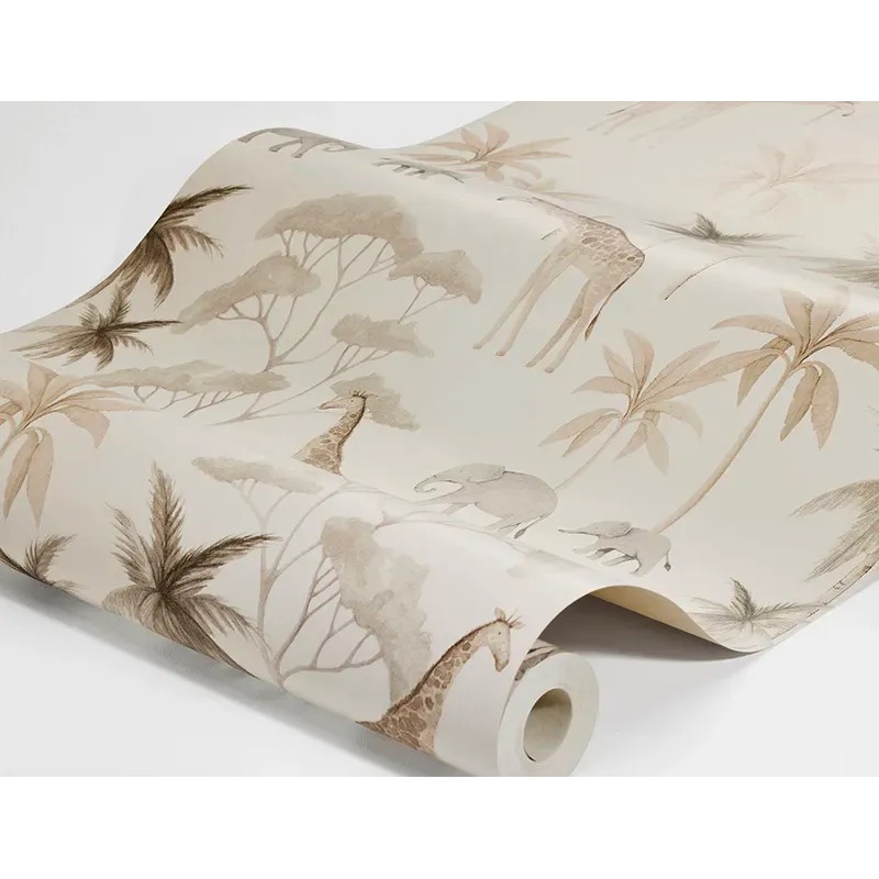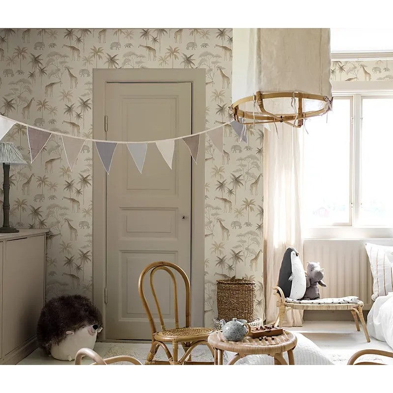 Nuestro papel pintado infantil Savannah en tonos naturales de lino claro, gris suave y beige dorado sobre un fondo de color arena captura la belleza atemporal del paisaje del que toma su nombre. Con un patrón encantador donde jirafas y elefantes conviven bajo las palmeras y acacias, llena las habitaciones con un carácter divertido y juguetón. Creado en colaboración con el estudio de diseño de Newbie, este papel pintado de Savannah es ideal para colgar en el estudio, el dormitorio o la guardería de su hijo para sumergirse en un mundo de inspiración y maravilla.