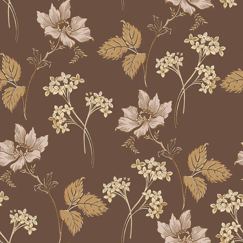 Papel pintado floral Valborg marrón oscuro y rosa delicado