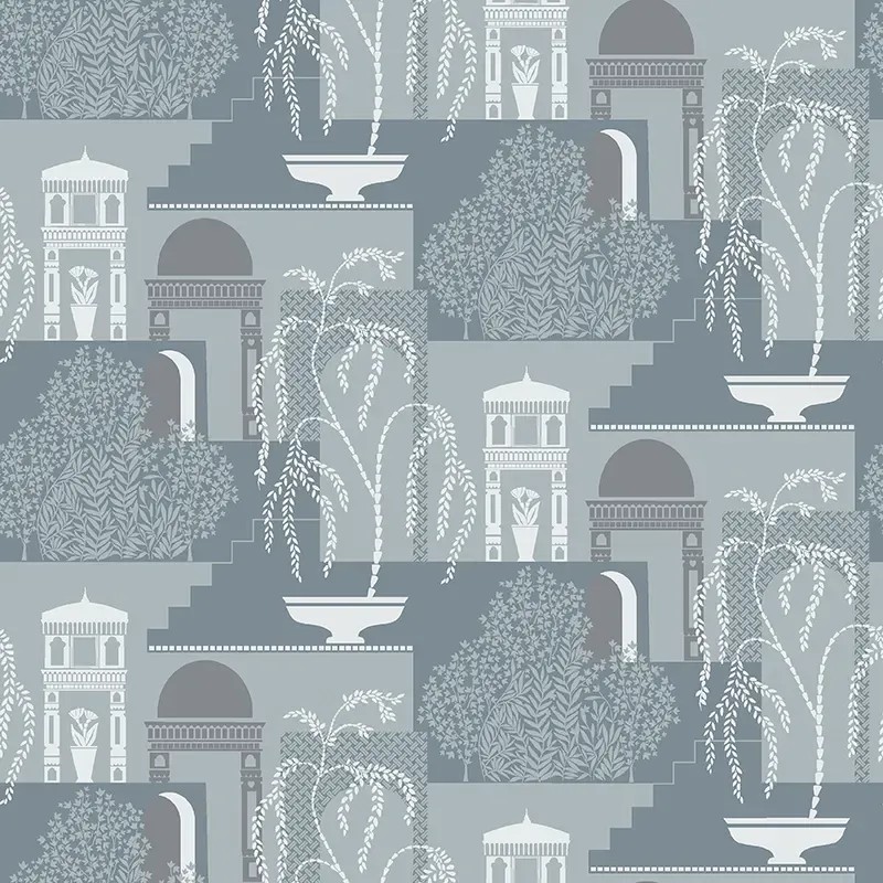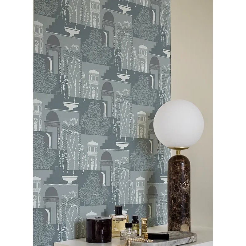 Sumérgete en la serena belleza de nuestro papel pintado Mimi en tonos contrastantes de gris-azul y blanco-gris. Su patrón clásico de siluetas y líneas limpias representa características ornamentadas de un jardín antiguo. Cuelga este hermoso papel pintado en tu pasillo, dormitorio o oficina y deja que la armoniosa mezcla de colores y el diseño de la década de 1920 aporten un toque de elegancia, profundidad y tranquilidad a tu espacio.