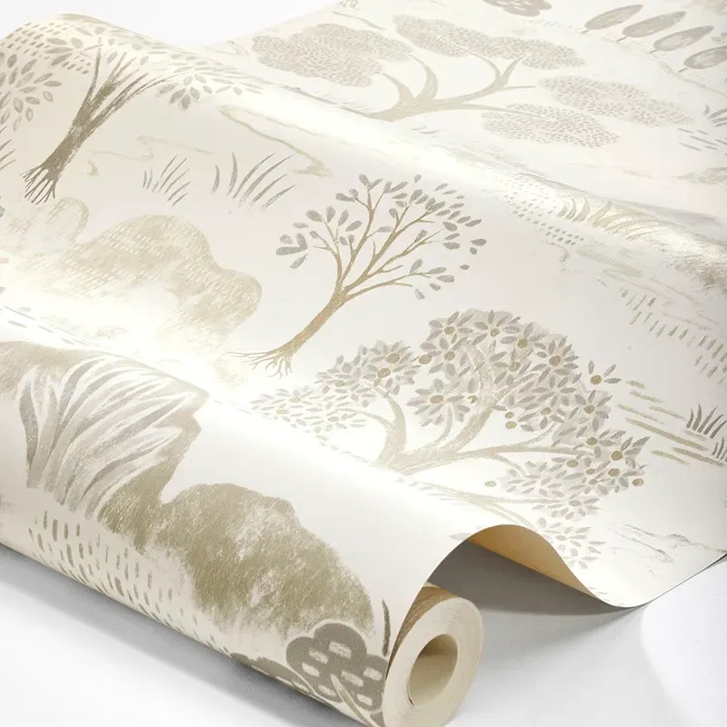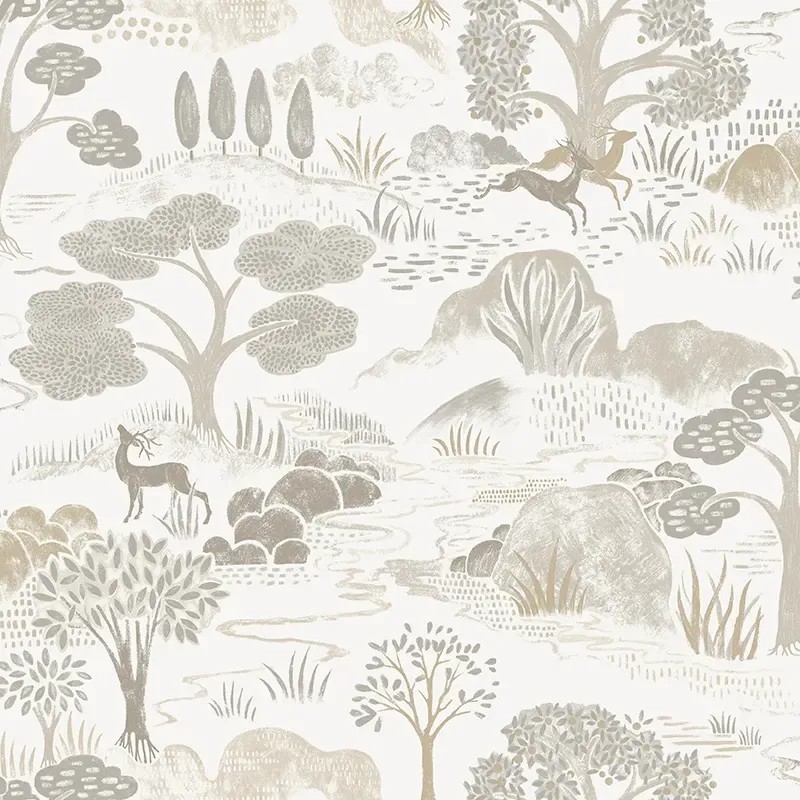 Sobre un fondo blanco fresco con cálidos tonos grises y beige, nuestro papel pintado Diana está lleno de aventura y emoción. Lleva el nombre de la diosa romana de la caza, y presenta un patrón de un río serpenteante y árboles maduros bajo los cuales los ciervos se refugian de la persecución. Cuelga el papel pintado Diana en tu dormitorio, escalera o cocina para conseguir una elegancia discreta y un espacio sereno.