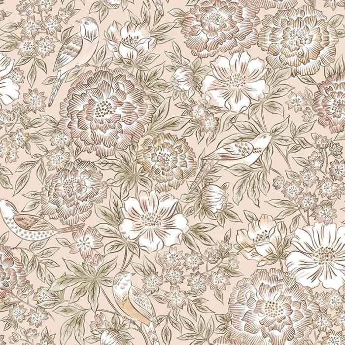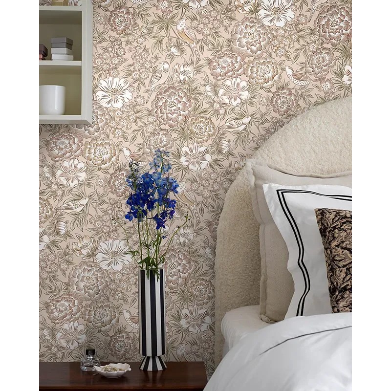 Infunde tu espacio con la delicada belleza de las flores en tonos albaricoque y rosa, decoradas con sutiles detalles de naranja oxidado. Un follaje gris oliva suave y apagado añade un toque de tranquilidad, mientras que las aves aportan una sensación de libertad y extravagancia. Cuelga el papel pintado Dagmar en tu cocina, pasillo o sala de estar y transpórtate a un sereno oasis en el jardín.