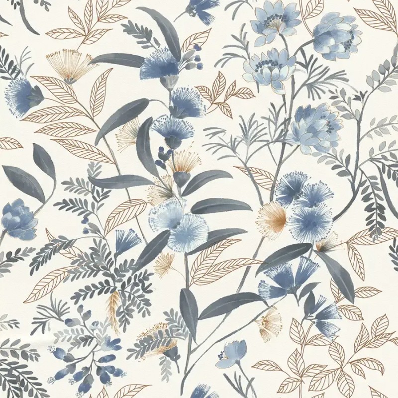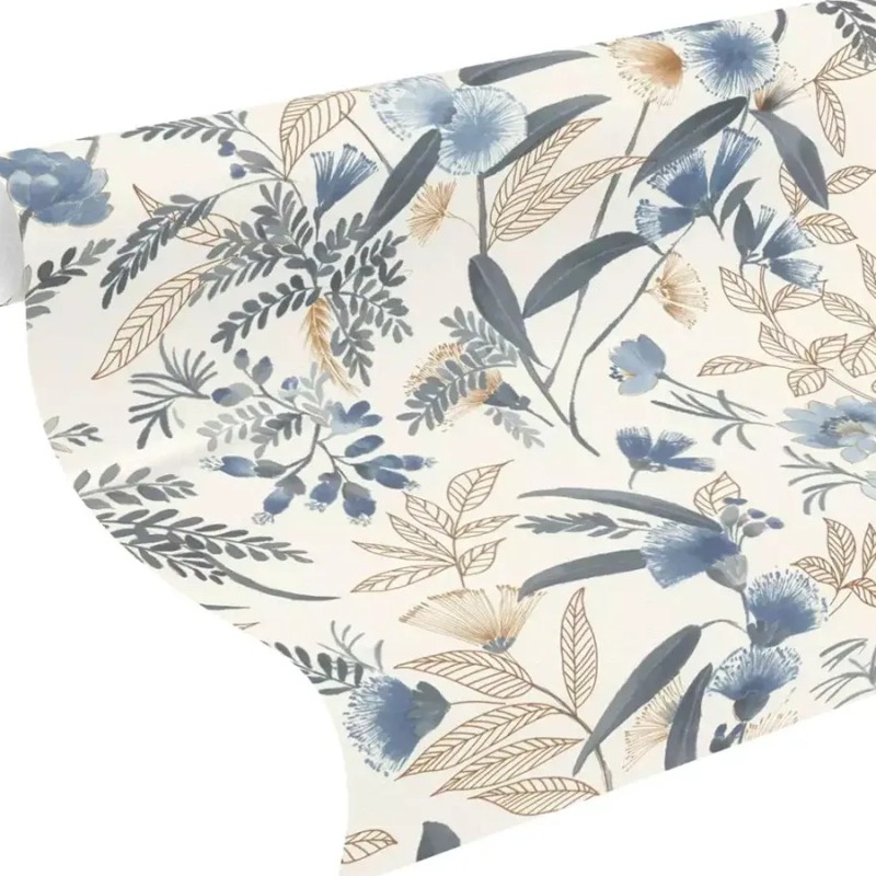 Este Papel pintado flores japonesas azul una elección acertada para renovar ambientes clásicos o modernos con estilo propio y sensación de amplitud. Rasch Symphony 869125.