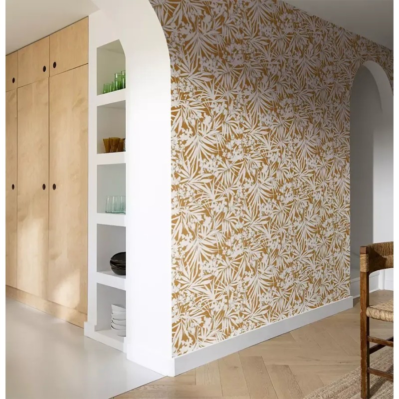 Este Papel pintado flores exóticas azul ocre perfecto para crear espacios acogedores con personalidad, aportando textura y luz a la decoración interior. Rasch Paraiso 330335.