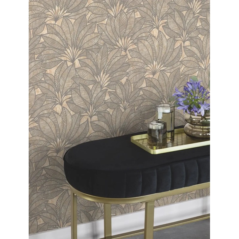Este Papel pintado estampado de hojas marrón un revestimiento decorativo perfecto para modernizar el hogar con armonía y estilo. Rasch Deco Style 542660.