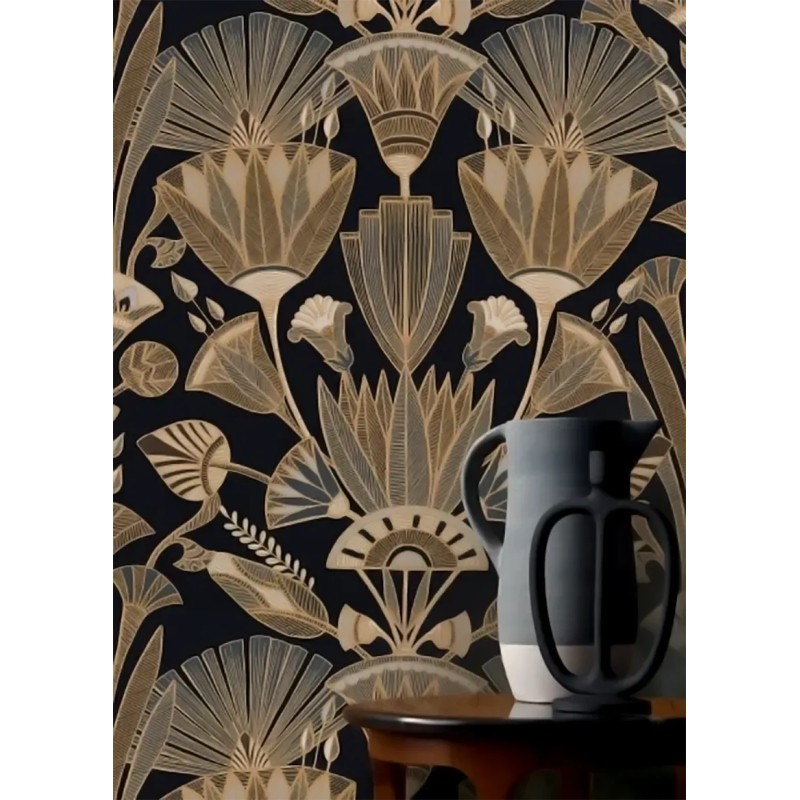 Papel pintado flores egipcias negro multicolor de Casamance, colección Bord du Nil. Calidad vinílico lavable, medidas: 68 cm x 10 m.
