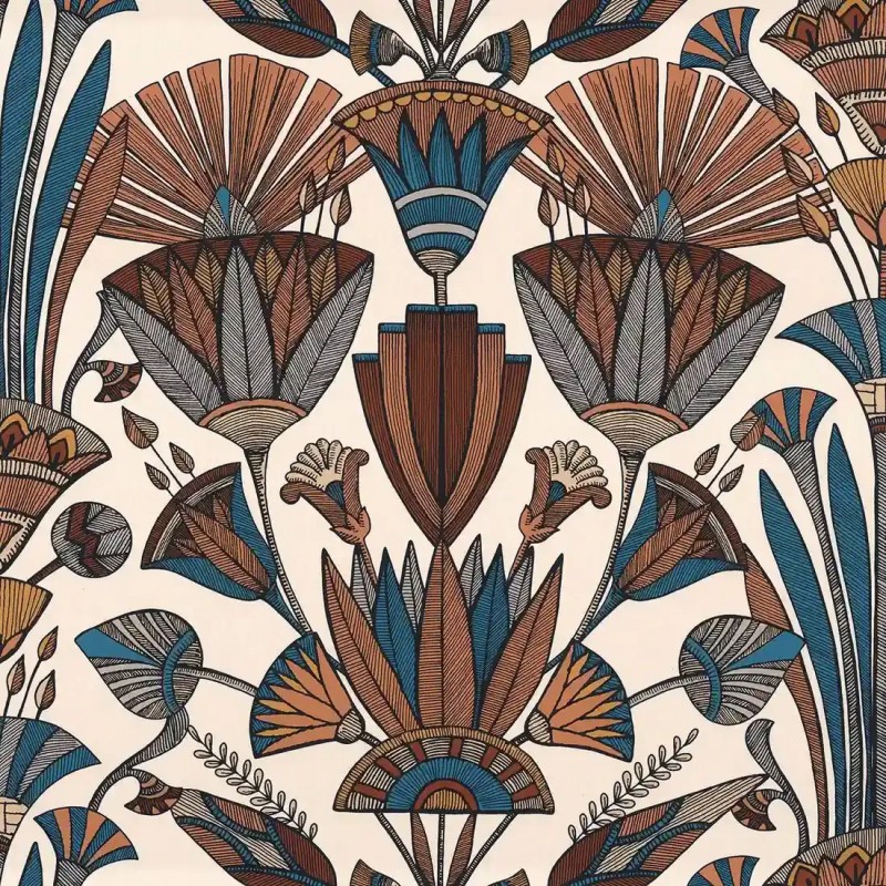 Papel pintado flores egipcias multicolor de Casamance, colección Bord du Nil. Calidad vinílico lavable, medidas: 68 cm x 10 m.