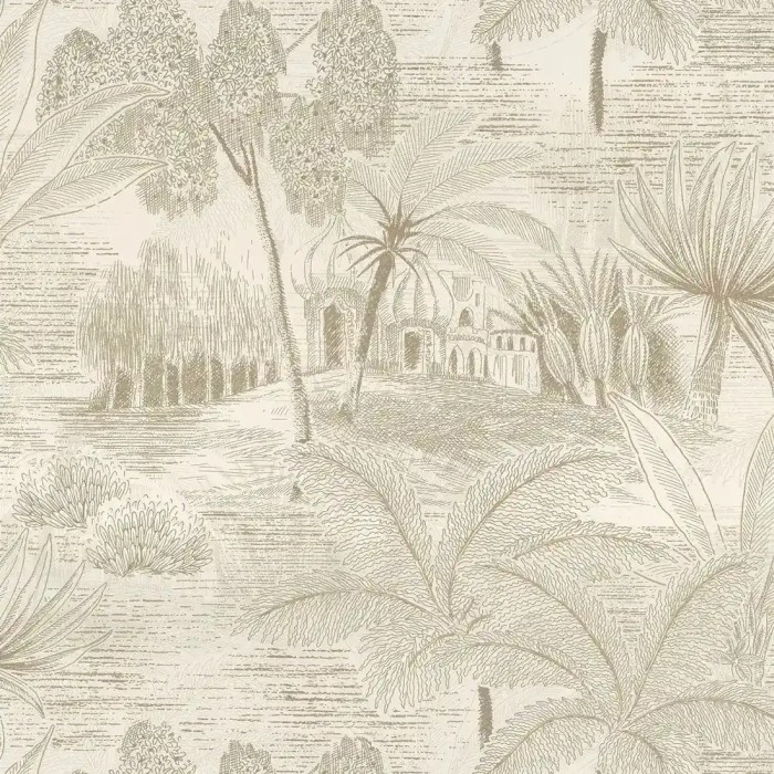 Papel pintado oasis con palmeras ocre de Casamance, colección Bord du Nil. Calidad vinílico lavable, medidas: 68 cm x 10 m.