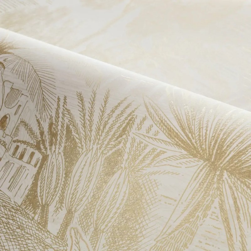 Papel pintado oasis con palmeras verde y dorado de Casamance, colección Bord du Nil. Calidad vinílico lavable, medidas: 68 cm x 10 m.