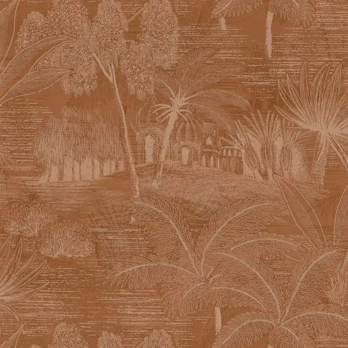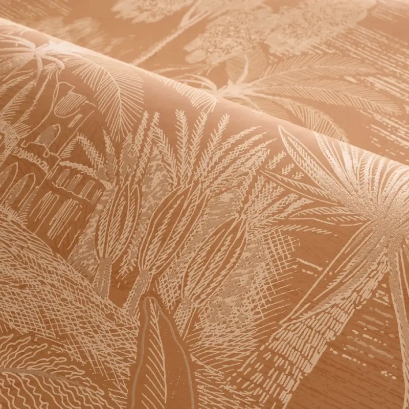 Papel pintado oasis con palmeras ocre de Casamance, colección Bord du Nil. Calidad vinílico lavable, medidas: 68 cm x 10 m.