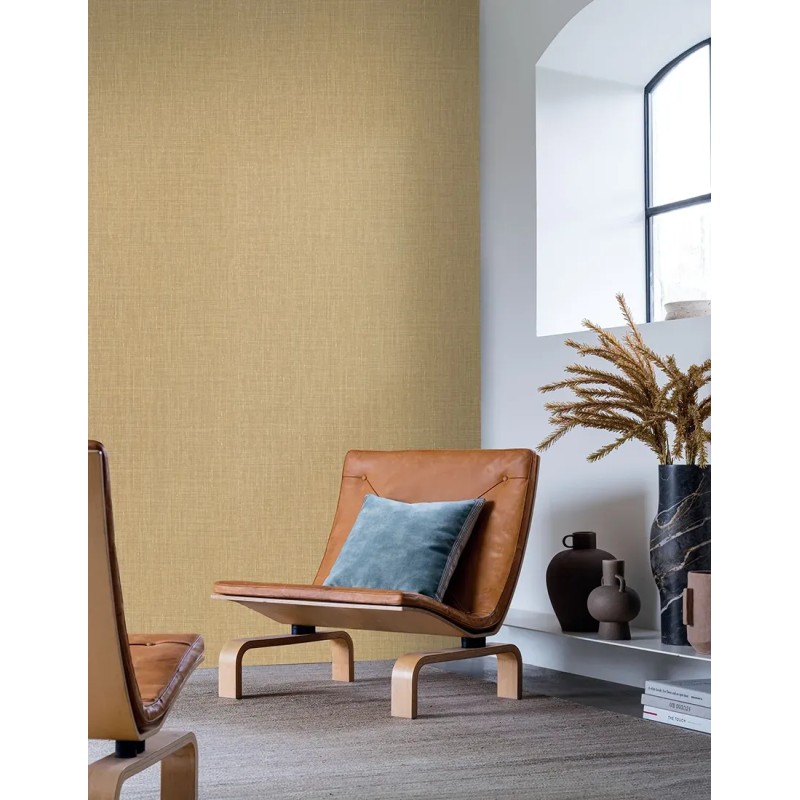 Papel pintado lino mostaza de Casamance, colección Le Lin 3. Calidad vinílico lavable, medidas: 70 cm x 10 m.