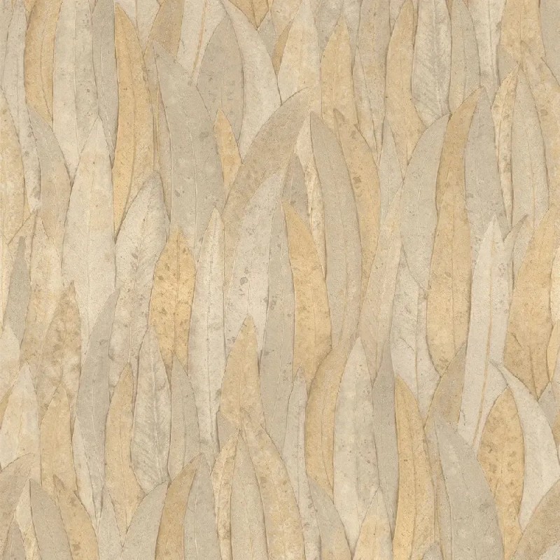Papel pintado mosaico hojas de eucalipto gris y dorado de Casamance, colección Nature Precieuse. Calidad vinílico lavable, medidas: 70 cm x 10 m.