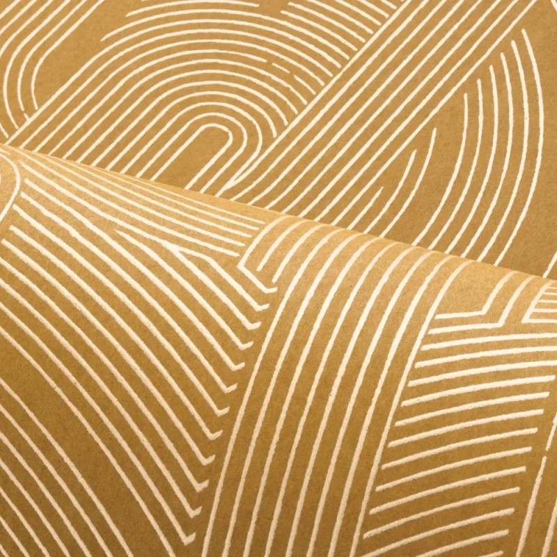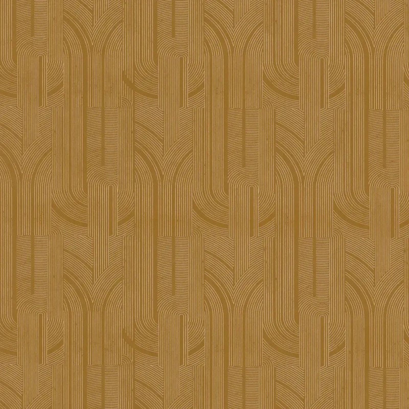 Papel pintado Art Decó amarillo y dorado gráfico de Casamance, colección Faubourg Des Lumières. Calidad vinílico lavable, medidas: 106 cm x 10 m.