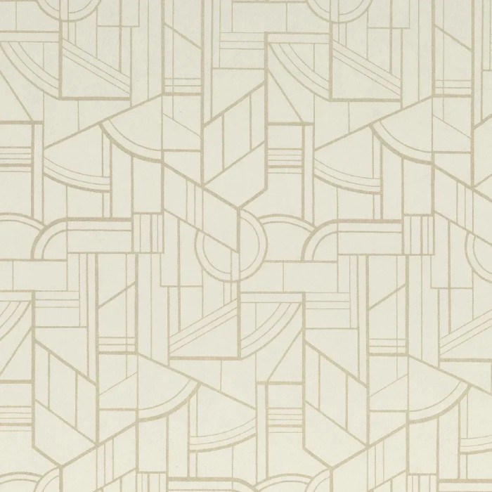 Papel pintado geométrico beige con patrón dorado de Casamance, colección Faubourg Des Lumières. Calidad vinílico lavable, medidas: 68 cm x 10 m.