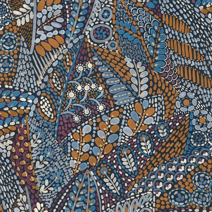 Papel pintado mexicano marrón flores y motivos geométricos de Casamance, colección Casa Azul. Calidad vinílico lavable, medidas: 70 cm x 10 m.