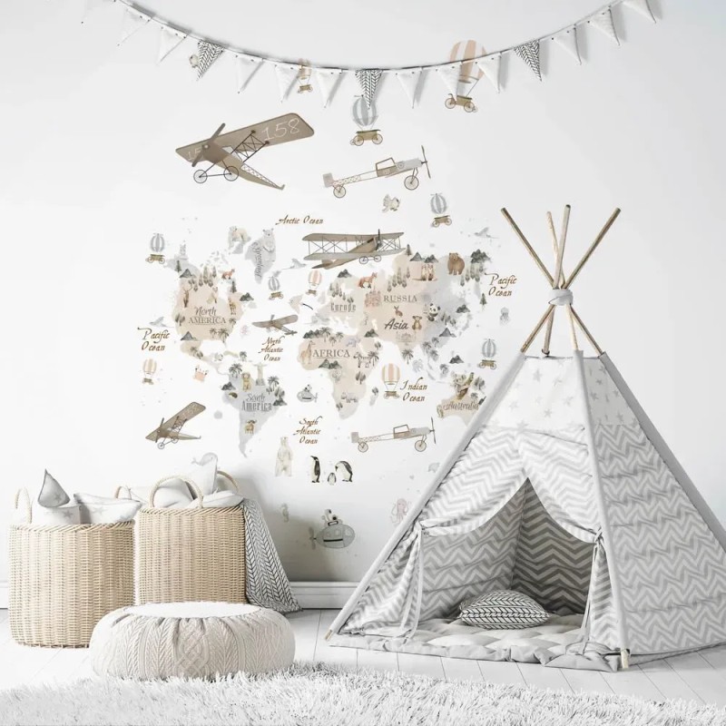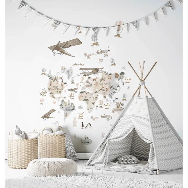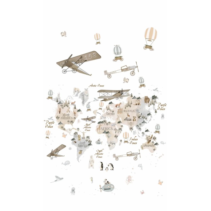 Mural de pared infantil beige mapamundi, aviones, animales y aventuras liso mate de Marburg colección Kids Walls. Medidas: 159 x 270 cm