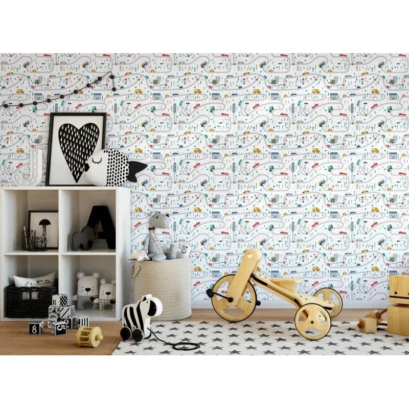 Papel pintado infantil gris coches en la ciudad, refleja buen gusto y modernidad. Marburg Kids Walls 45846.