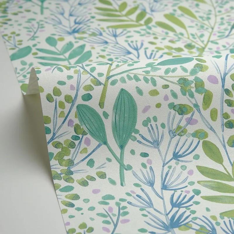Papel pintado floral efecto acuarela verde y malva