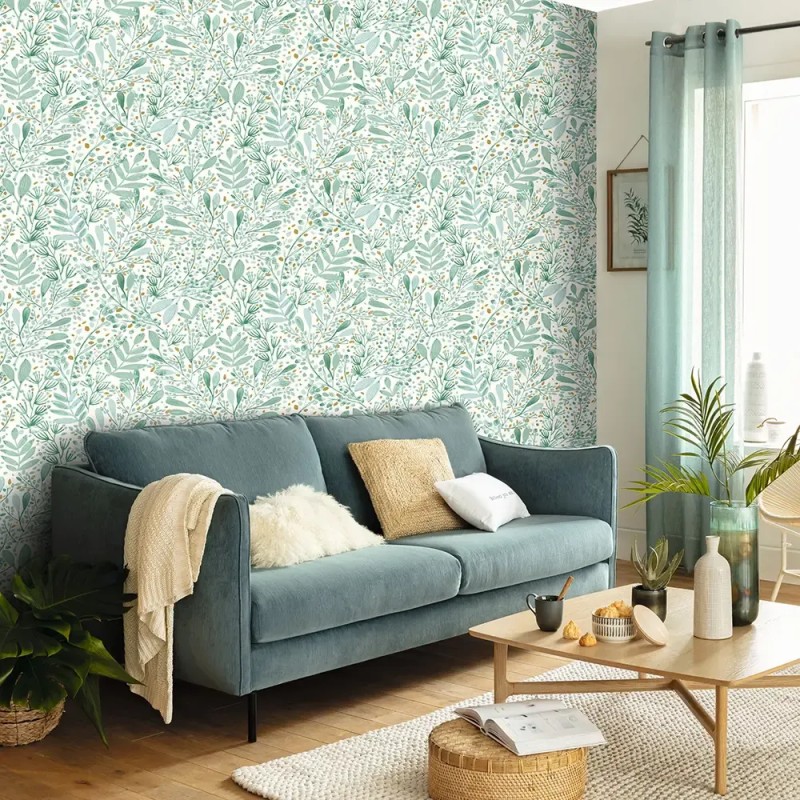 Papel pintado floral tonos pastel verde. Caselio Green Life, papel de pared calidad tejido no tejido lavable. Medidas: 53 cm x 10 metros