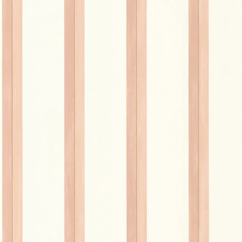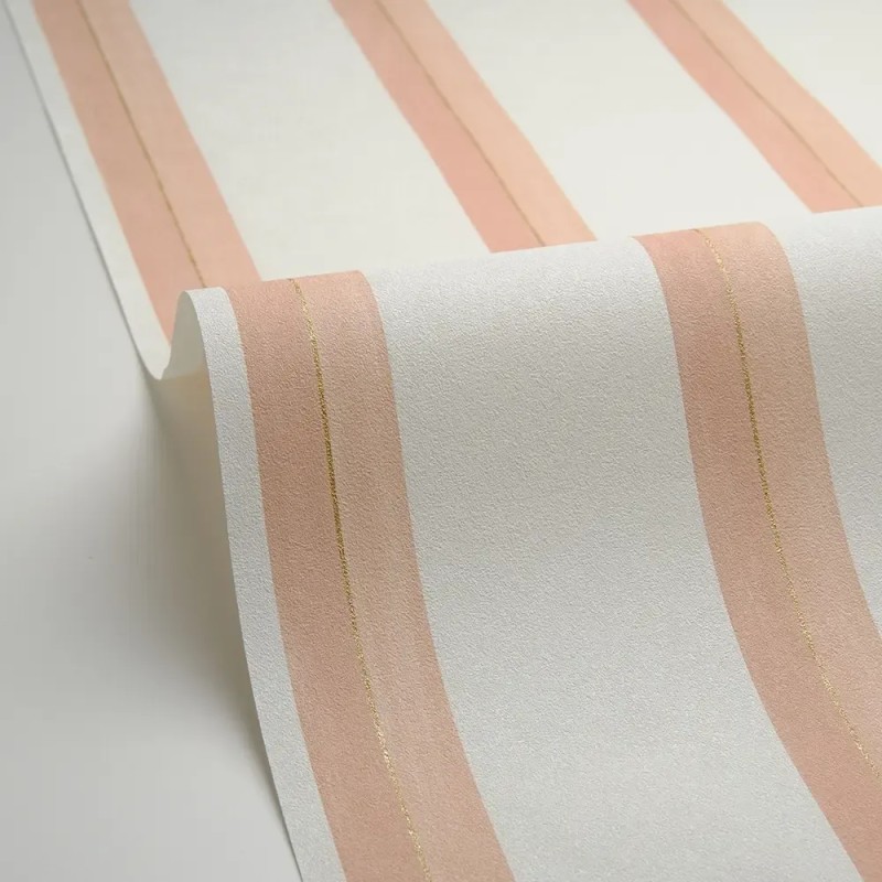 Este papel pintado de rayas... Caselio Satisfaction Vieux Rose Or sigue el camino de nuestros deseos, donde cada línea de dos tonos está subrayada por un fino borde dorado, que recuerda a las vetas de las hojas de los árboles.