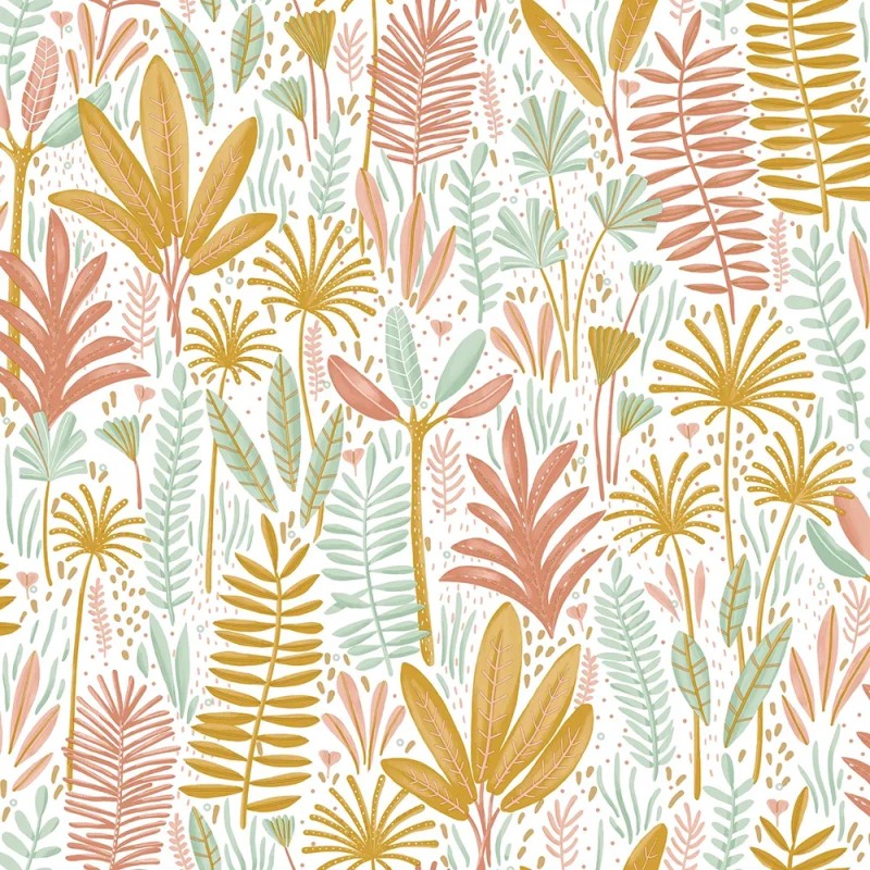 Papel pintado infantil flores verde pastel. Caselio Les Minis Mondes, papel de pared calidad tejido no tejido lavable. Medidas: 53 cm x 10 metros