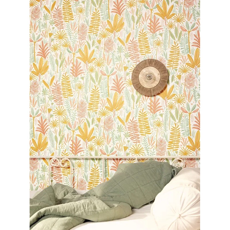Papel pintado infantil dibujos de flores verde. Caselio Les Minis Mondes, papel de pared calidad tejido no tejido lavable. Medidas: 53 cm x 10 metros