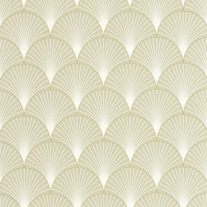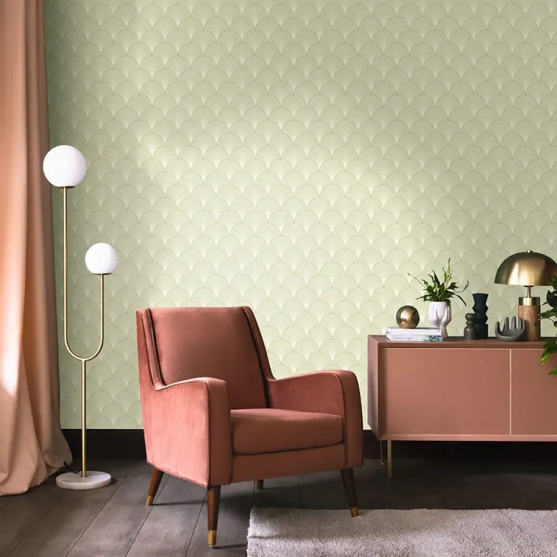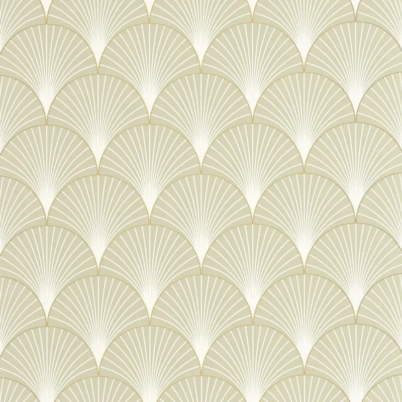 Papel pintado art déco verde, formas de abanico metalizado. Caselio Elegance, papel de pared calidad tejido no tejido lavable. Medidas: 53 cm x 10 metros