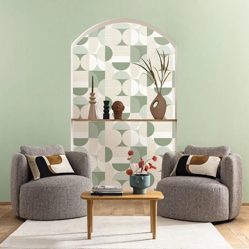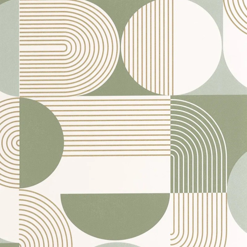 Papel pintado geométrico tonos verdes, estilo moderno. Caselio Graphic, papel de pared calidad tejido no tejido lavable. Medidas: 53 cm x 10 metros