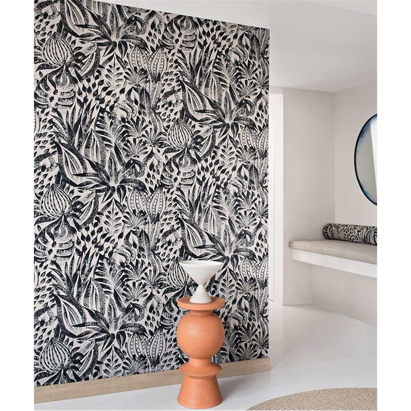 Una profusión de vegetación sobre un tejido 100% lino, el revestimiento de pared Casamance Foliage Noir y su lujoso follaje se imprime mediante la técnica de serigrafía/impresión con una plantilla, un patrón floral y una tinta espesa repetidamente. Esta técnica reproduce los detalles de las hojas y arbustos manteniendo un aspecto “hecho a mano”. Casamance ha seleccionado cuidadosamente los colores de las tintas para que estén en armonía con el tono natural del lino. FOLIAGE está disponible en tres colores: blanco o negro sobre base de lino natural y verde sobre base de lino blanco.