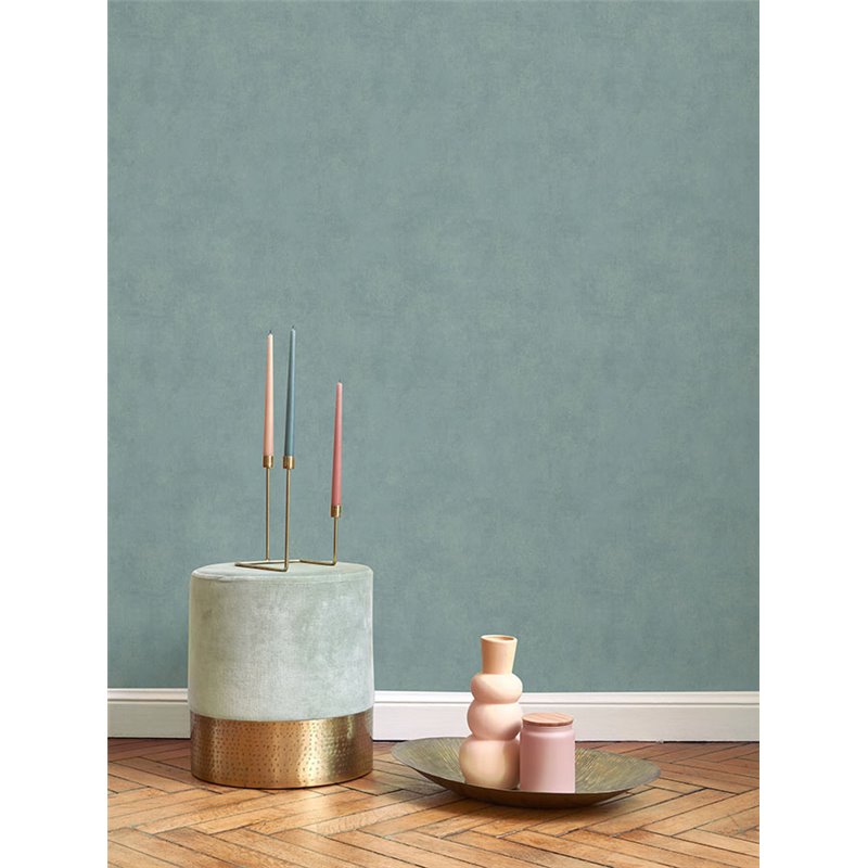 Papel pintado estuco verde agua con efecto desgastado, ideal para salones o dormitorios con estilo sobrio y atemporal.