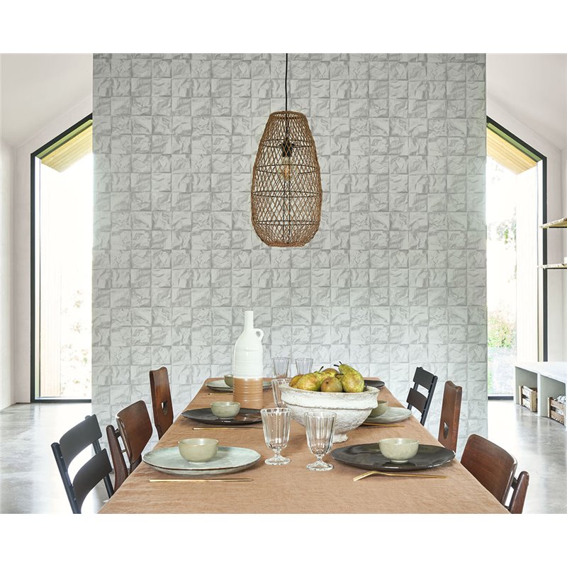 Papel pintado estilo orienta gris claro con cuadrados de papel arrugado tipo origami, una opción serena y elegante para crear espacios acogedores.