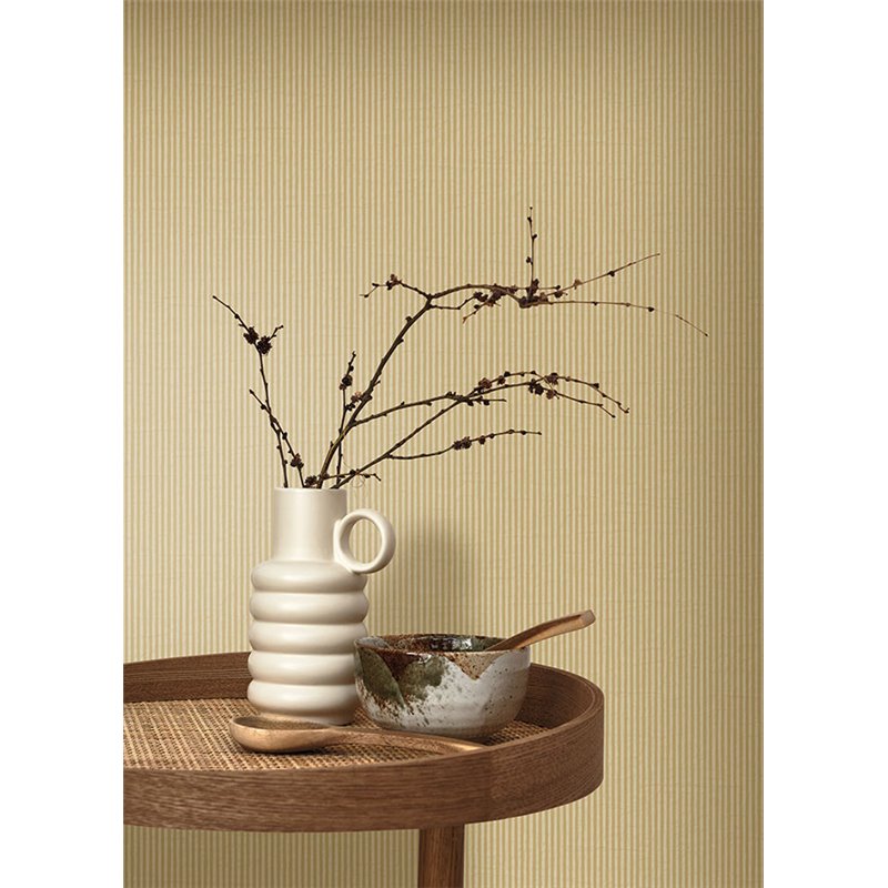 Papel pintado micro rayas beige, elegante y atemporal, con un aire natural y envejecido que realza interiores sobrios.