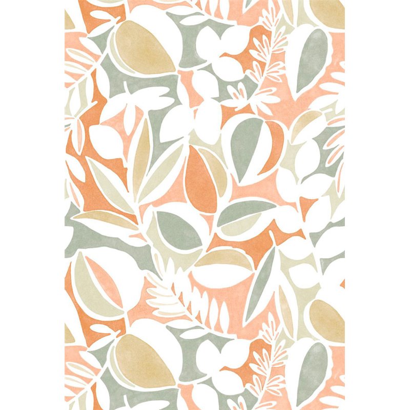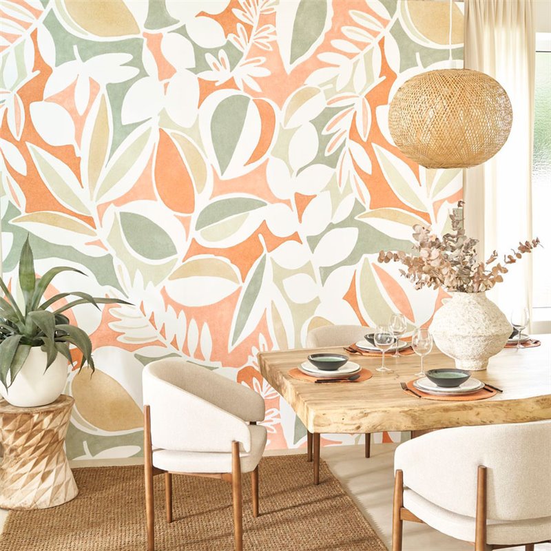 Mural pared floral hojas y frutas mid-century naranja