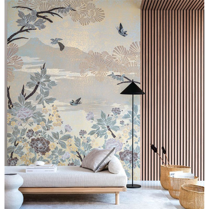 Con la belleza de un paisaje oriental, el mural de pared Casamance Kansai Blanc/Doré te cautivará con su composición artística de flores japonesas, hojas de árboles con forma de abanicos, pájaros y una vista de siluetas montañosas al fondo que bién podria ser el monte Fuji. Disponible en tres variantes de colores.