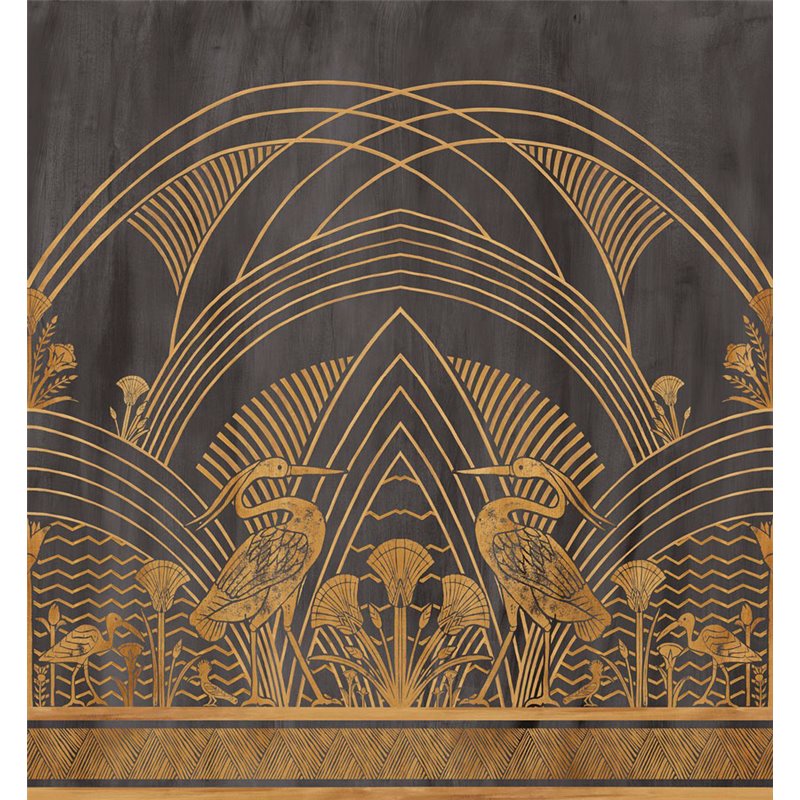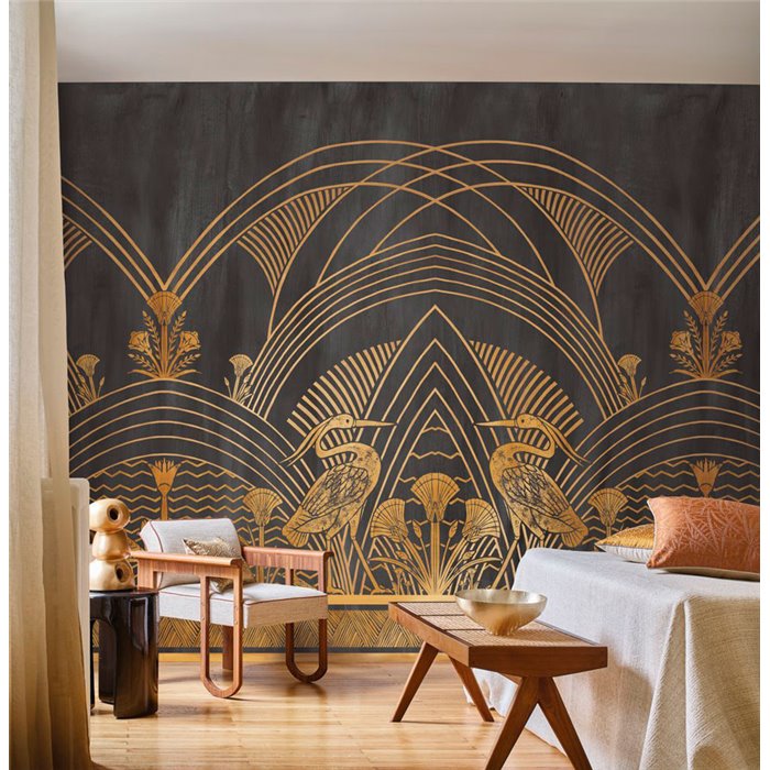 Mural pared estilo Art Déco con garzas y formas geométricas de arcos superpuestos. Colores blanco/amarillo, Casamance Éléphantine Blanc/Doré. Medidas: 280 x 300 cm