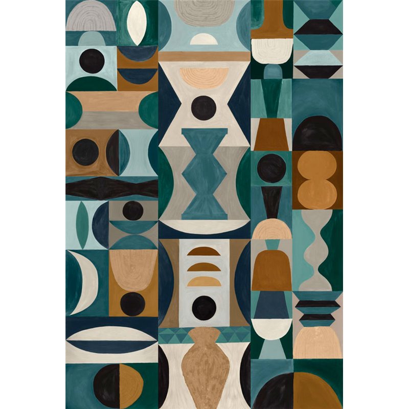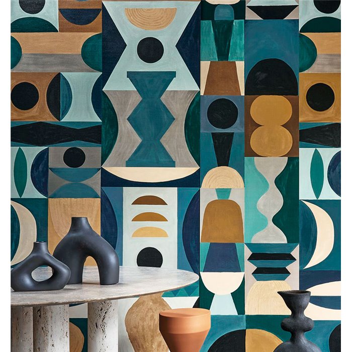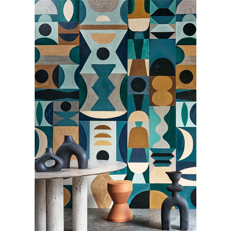 Mural pared composición abstracta con varias formas orgánicas y geométricas superpuestas multicolor, Casamance Audria Multico. Medidas: 272 x 300 cm