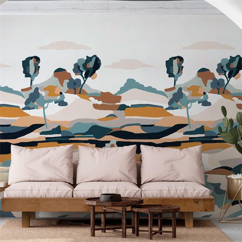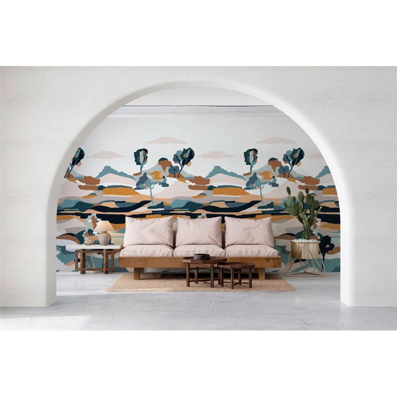 Mural pared escena de paisaje estilizada con un enfoque abstracto. Colores beige/blanco, Casamance Le Bassin Blanc/Sable. Medidas: 210 x 300 cm