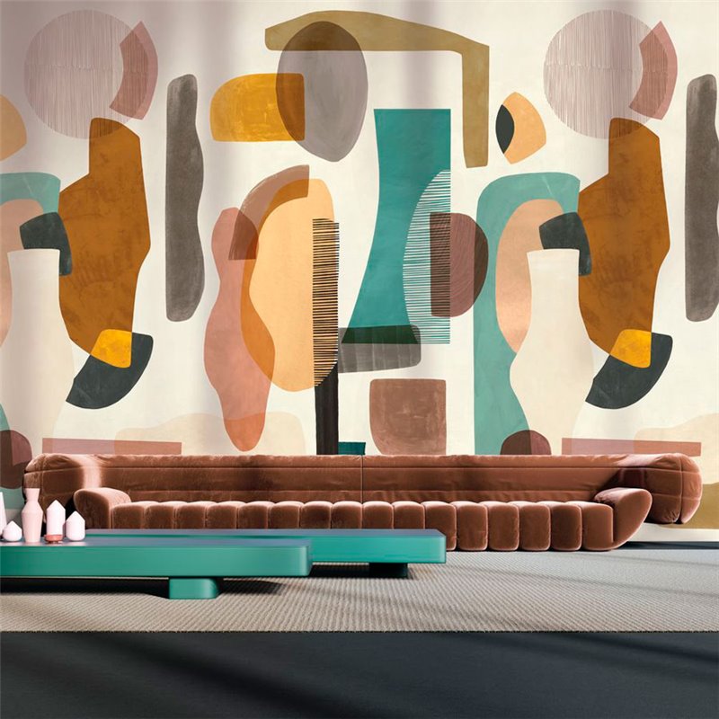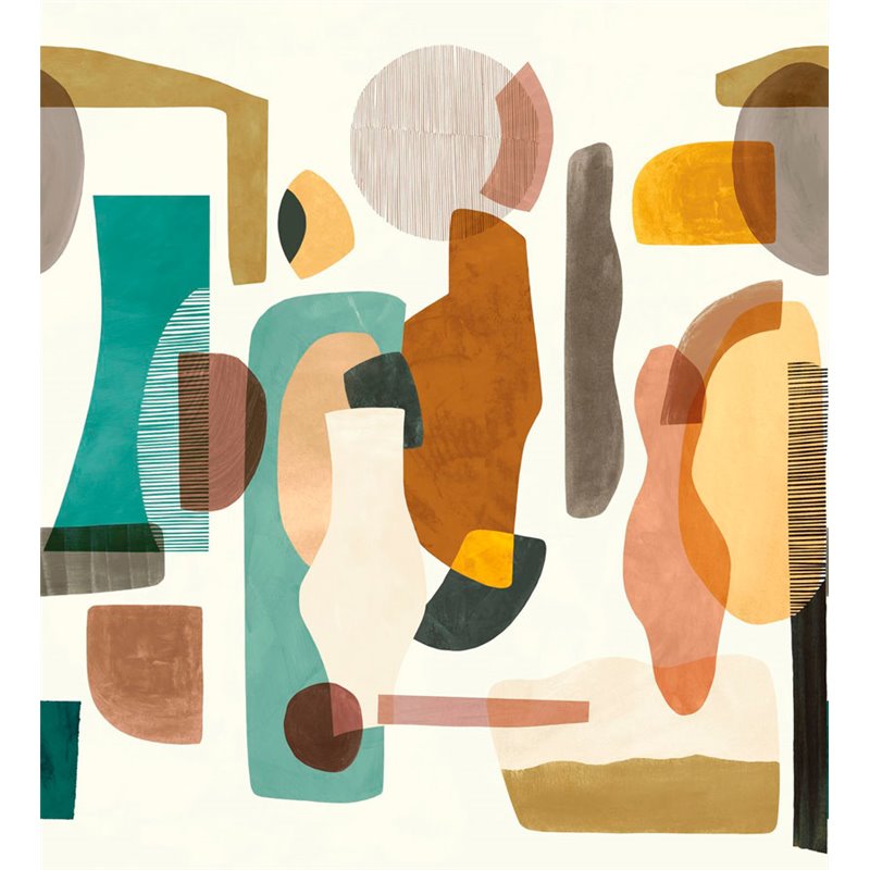 Mural pared composición abstracta con varias formas orgánicas y geométricas superpuestas multicolor, Casamance Audria Multico. Medidas: 272 x 300 cm