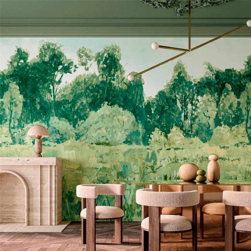 Mural pared paisaje boscoso al óleo estilo impresionista verde