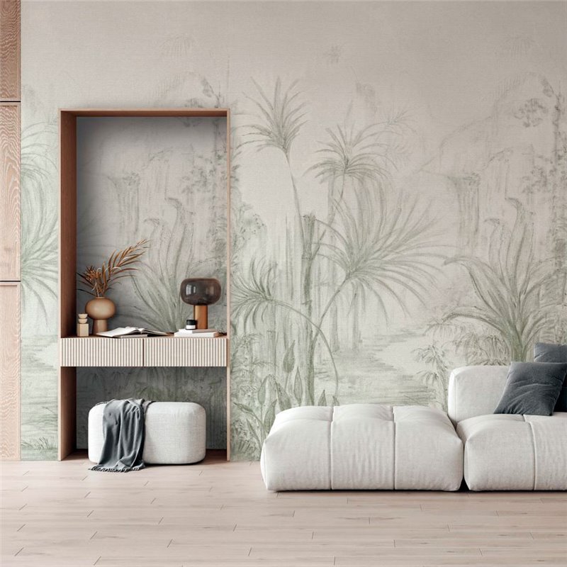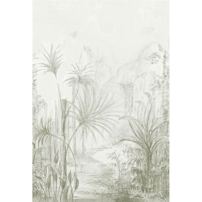 El mural de pared Casamance Arille Lichen ilustra un dibujo al carboncillo de un paisaje tropical con palmeras, la delicadeza de las tonalidades combina de maravilla con la finura de las líneas. Los tonos sugieren la suavidad del aire y una atmósfera tranquila al borde de un palmeral. Compuesto por tres gotas, el mural panorámico ARILLE de Casamance se presenta en dos versiones: caqui y sepia.