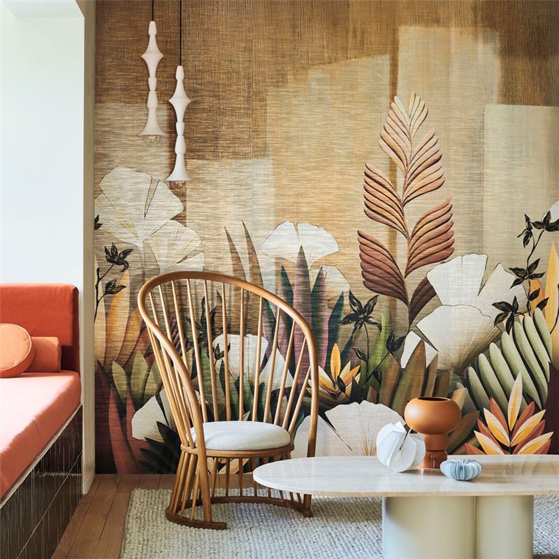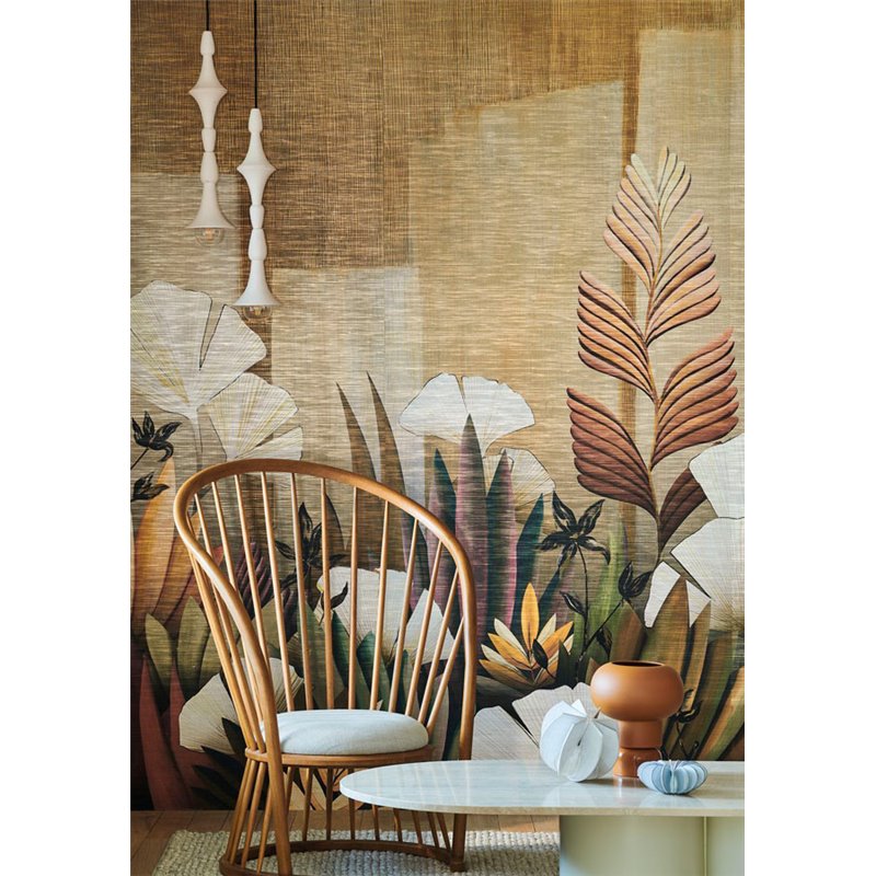 Icho es el nombre japonés del gingko biloba y conocido como “árbol de la juventud”. El mural de pared Casamance Icho Paille / Multicouleurs representa un jardín imaginario donde se vislumbran hermosas tonalidades entre las diferentes especies vegetales, realzadas por un tejido aireado. El mural panorámico ICHO de Casamance está creado mediante impresión digital sobre una base no tejida, cubierta por una lámina metálica y luego por una fina lona de papel y algodón. Disponible en dos colores: uno en tonos bronce dorado; el otro es multicolor, combinando caqui, ocre y amarillo.