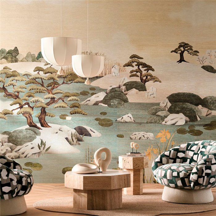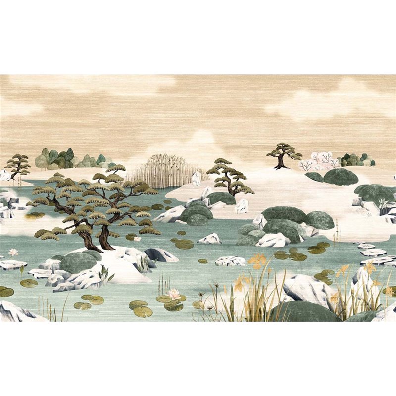 Mural pared paisaje oriental jardín y estanque japonés verde