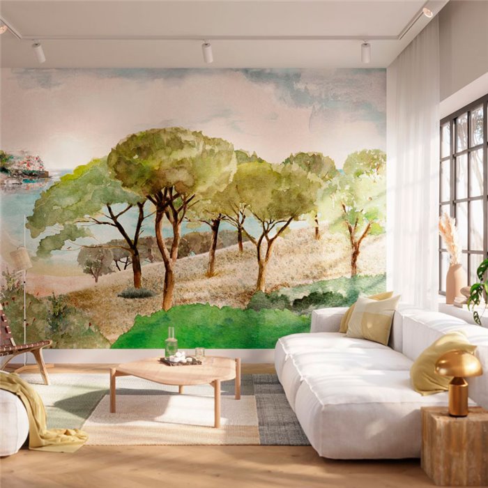 Mural pared paisaje mediterráneo con pinos y pueblo costero