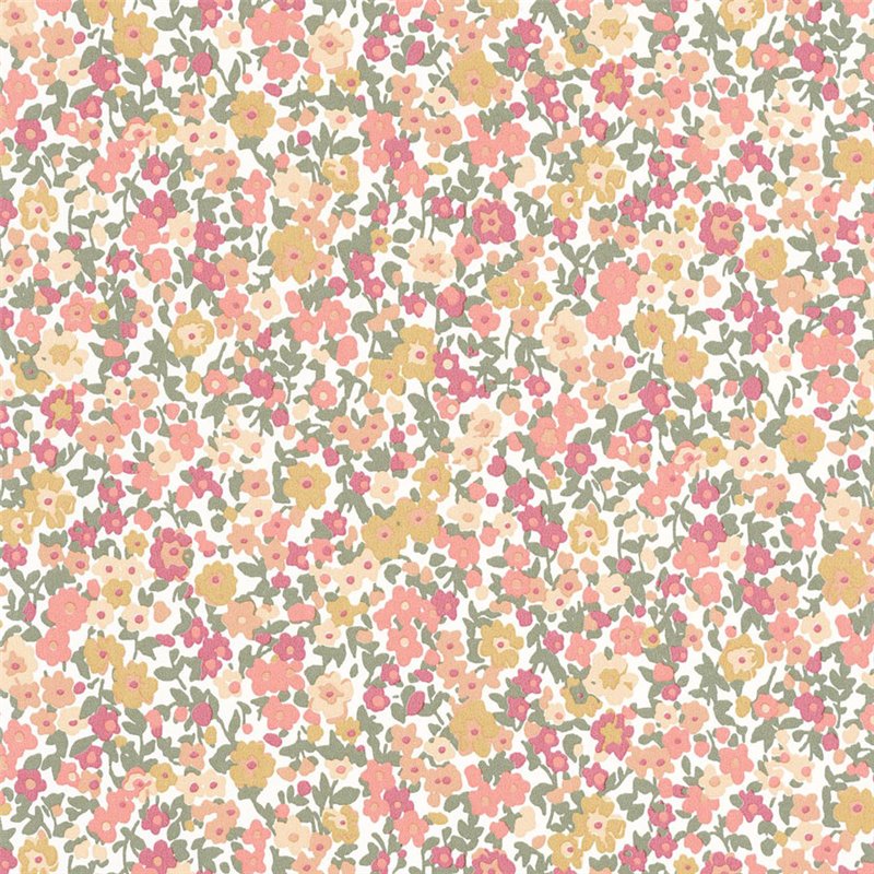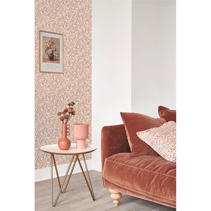 Cheerful floral wallpaper, multicolored small flowers, adds a touch of aged character to minimalist settings.