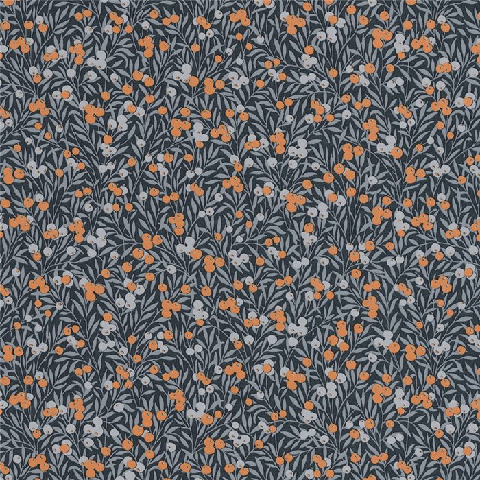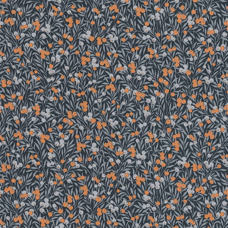 Papel pintado floral con grosellas rojas y arándanos, con un aire natural y envejecido que realza interiores sobrios.